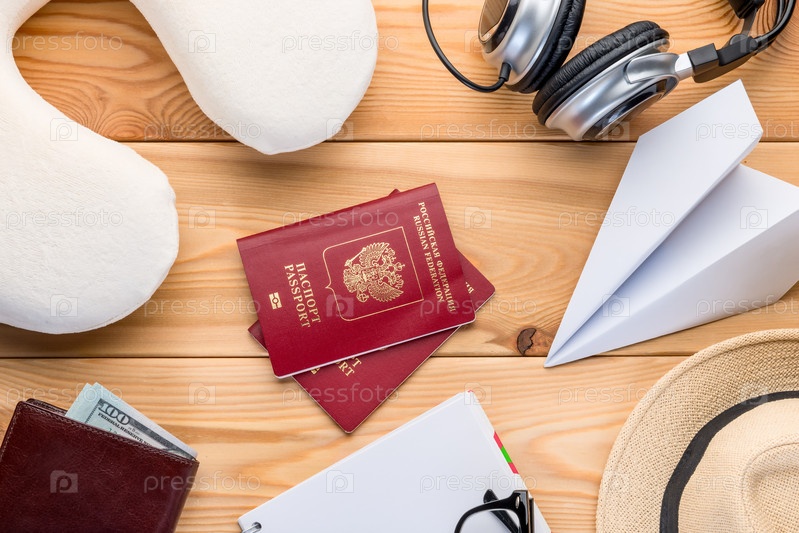 Набор предметов для комфортного путешествия на самолете, лежащих плоско на деревянном фоне