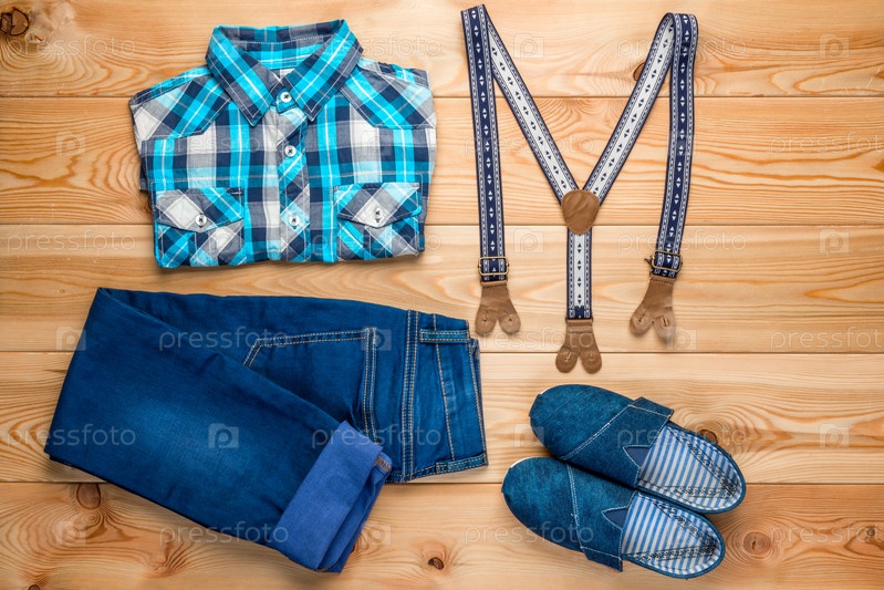Набор одежды для мальчика в сельском стиле вид сверху на деревянном полу
