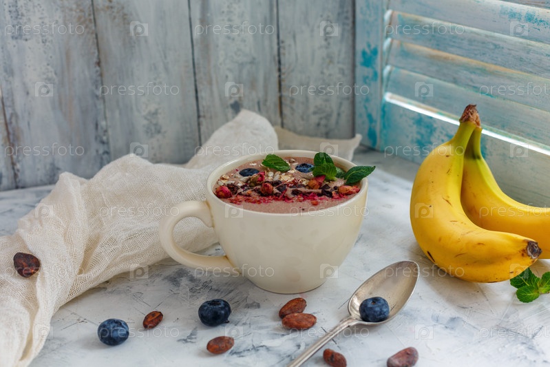 Чаша с смузи с шоколадом, какао-бобами и чернилами