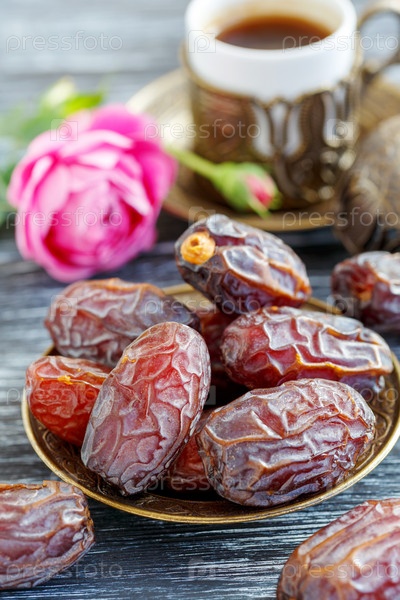Вкусные финики на бронзовой тарелке