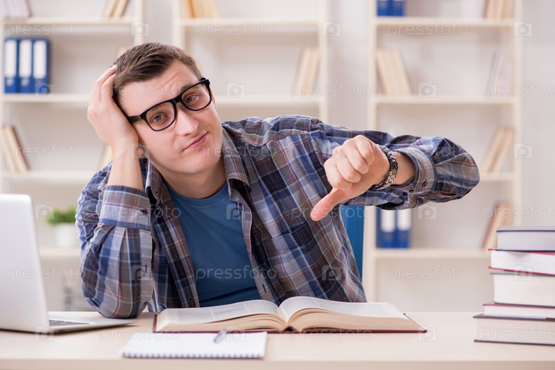 Молодой студент готовится к школьным экзаменам с помощью книг
