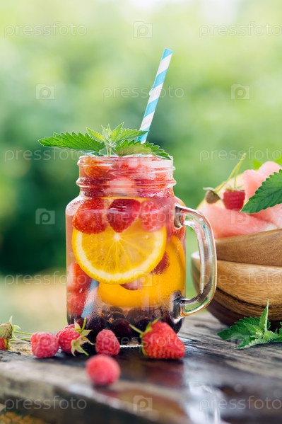 Свежая фруктовая и ягодная вода в стеклянной банке
