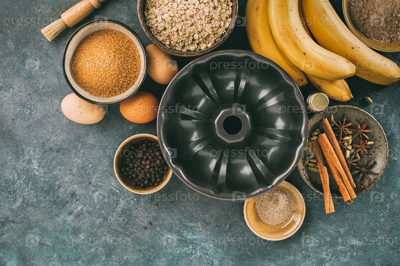 Тортовая кастрюля с ингредиентами для выпечки, мука, масло, сахар, яйца и специи