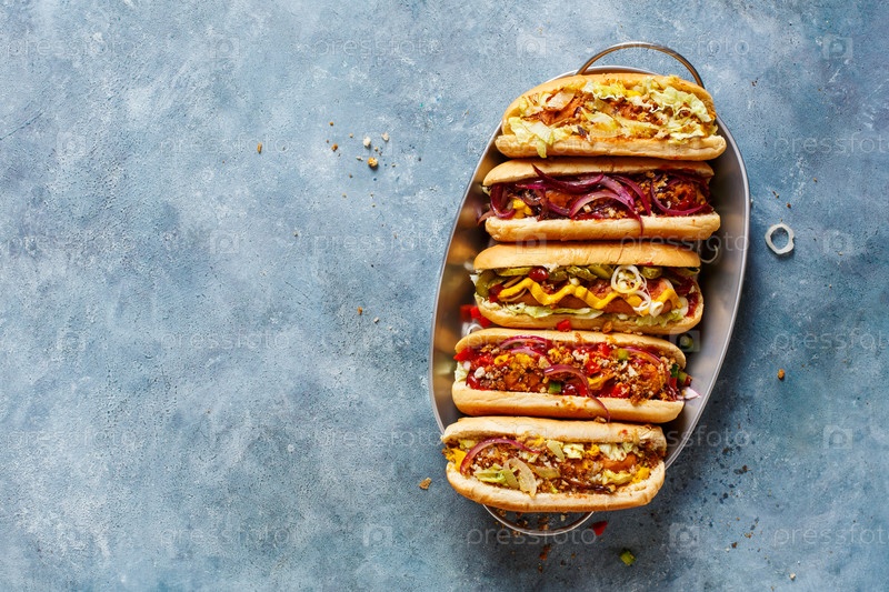 Вкусные хот-доги на подносе на синем фоне