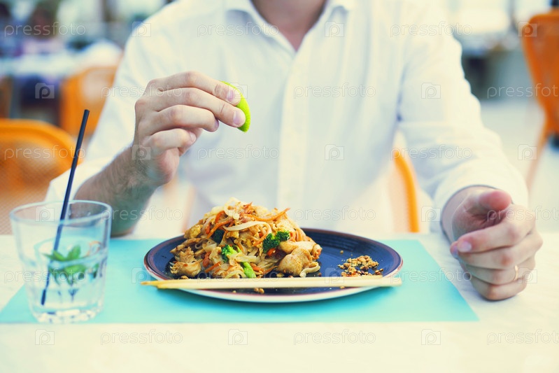 Тайский мужчина в тайском ресторане, ест на таиландской кухне