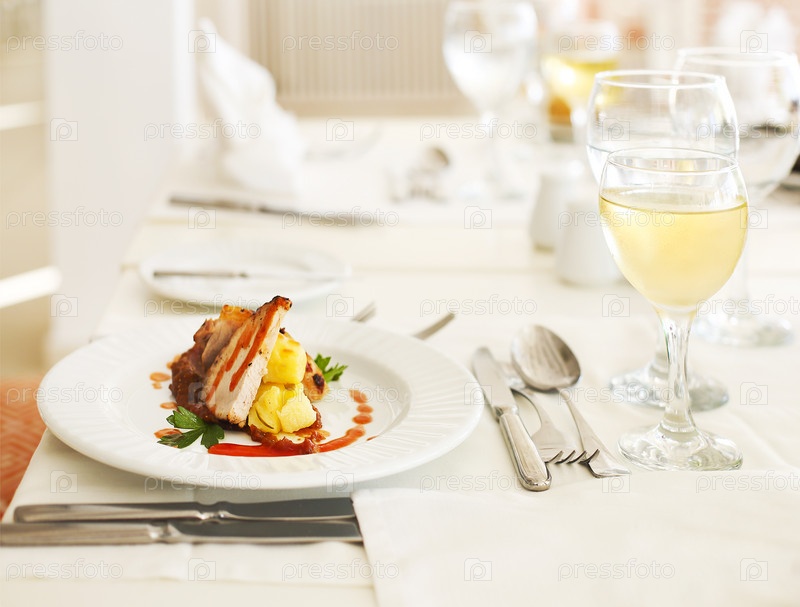 Ужин с белым вином и мясом