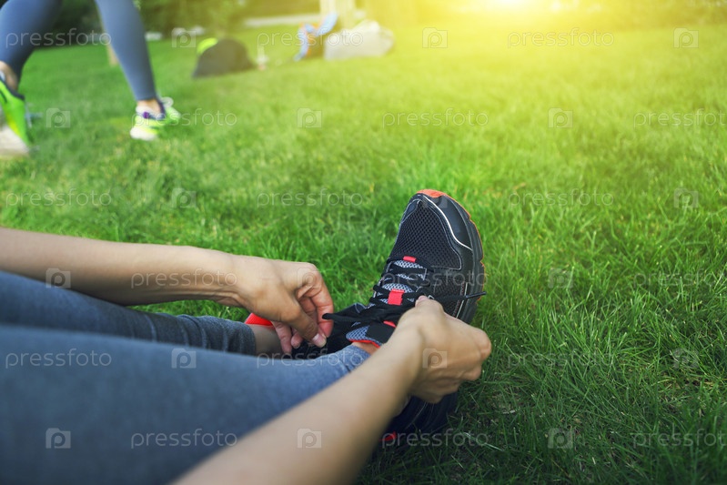Женщина завязывает обувь для бега перед тренировкой