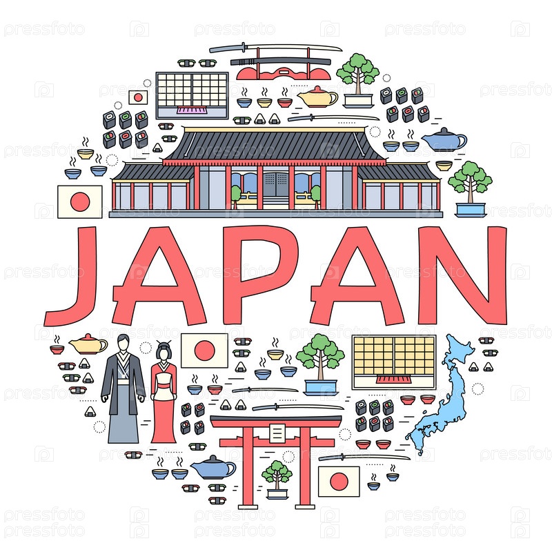 Страна Япония путешествие отпускное руководство по товарам, местам и особенностям. Набор архитектуры, моды, людей, предметов, концепции фона природы. Инфографический шаблон дизайна для веб-сайта и мобильных устройств на тонких линиях
