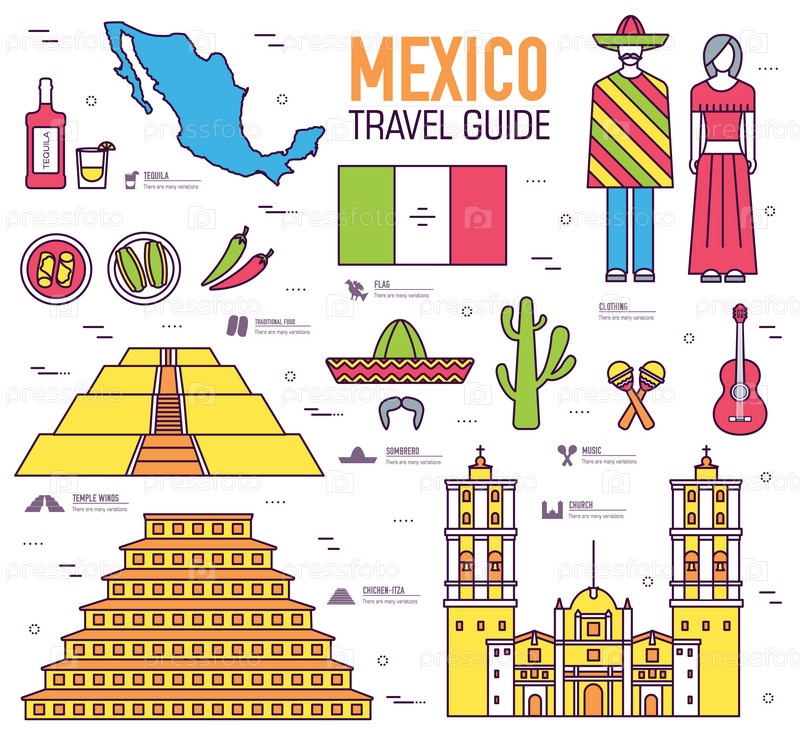 Страна Мексика путешествие отпускное руководство по товарам, местам и особенностям. Набор архитектуры, еды, моды, предметов, концепции фона природы. На тонких линиях стиль