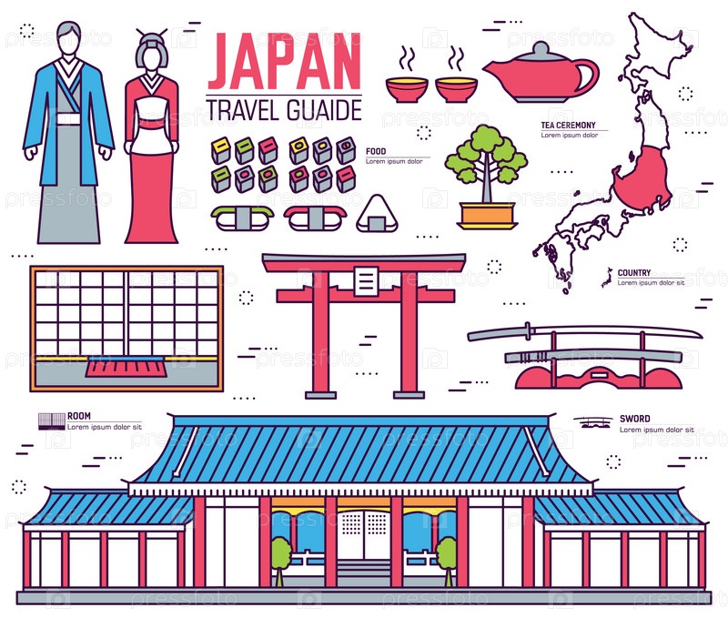 Страна Япония путешествие товаров, мест и особенностей в тонких линиях стильный дизайн. Набор архитектуры, моды, людей, предметов, концепции фона природы