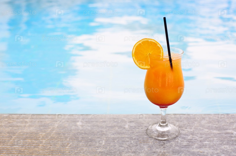 Стакан тропического коктейля у бассейна