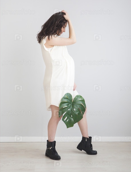 Брюнетка беременная женщина, держащая лист монстеры