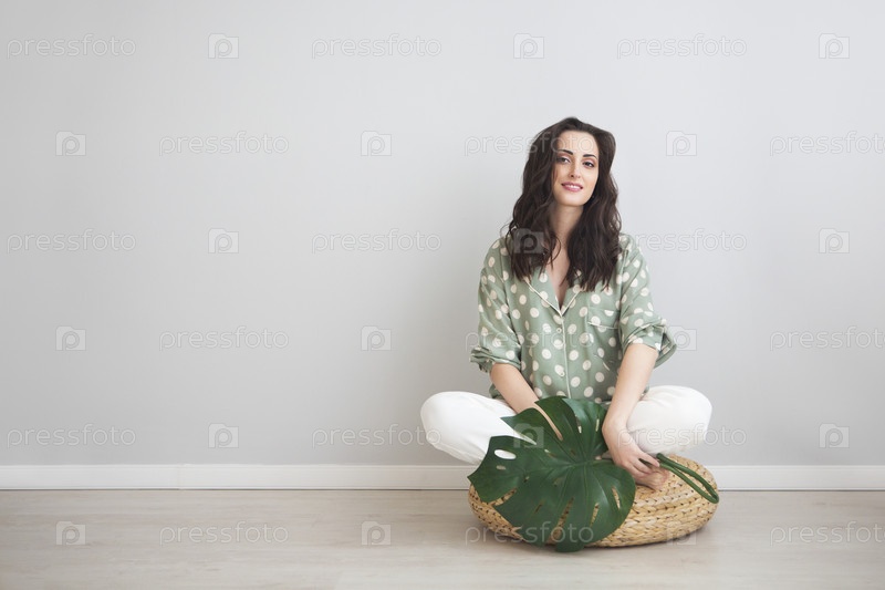 Брюнетка беременная женщина, держащая лист монстеры