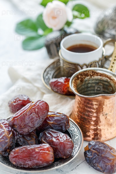 Вкусные финики на бронзовой тарелке и черный кофе