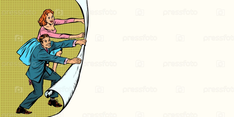 Копируйте фоновое пространство с мужчиной и женщиной, разворачивающими бумажный фон