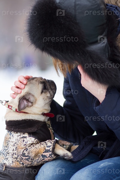 Рыжеволосая девушка с мопсом