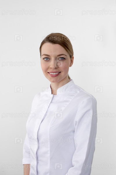 Женщина улыбается, глядя на камеру на белом фоне