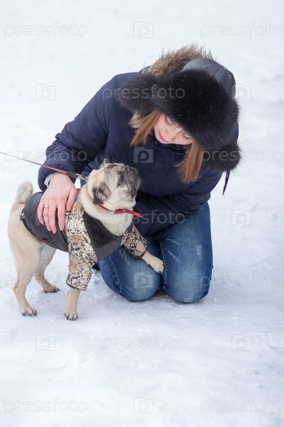 Рыжеволосая девушка с мопсом