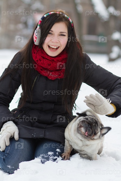 Девушка с щенком мопса в снегу