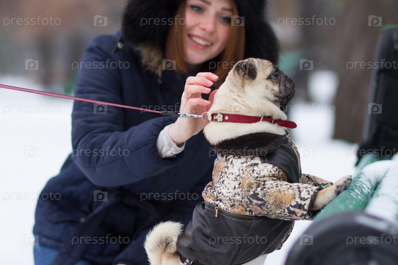 Рыжеволосая девушка с мопсом