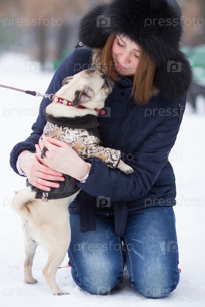 Рыжеволосая девушка с мопсом