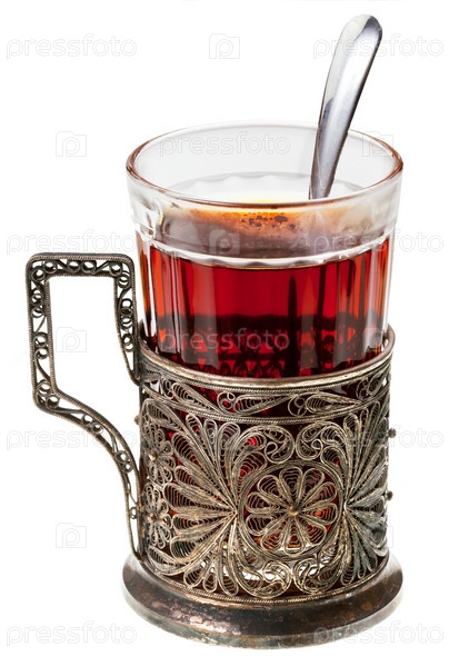 Черный чай в старинном стакане с чайной ложкой