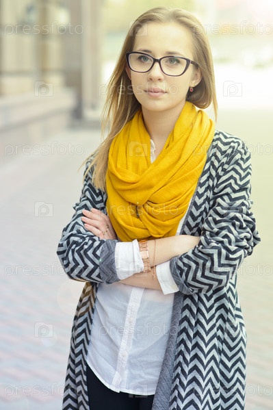 Девушка в синей куртке и желтом шарфе