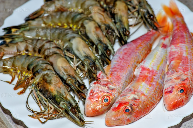 Свежая рыба, креветки