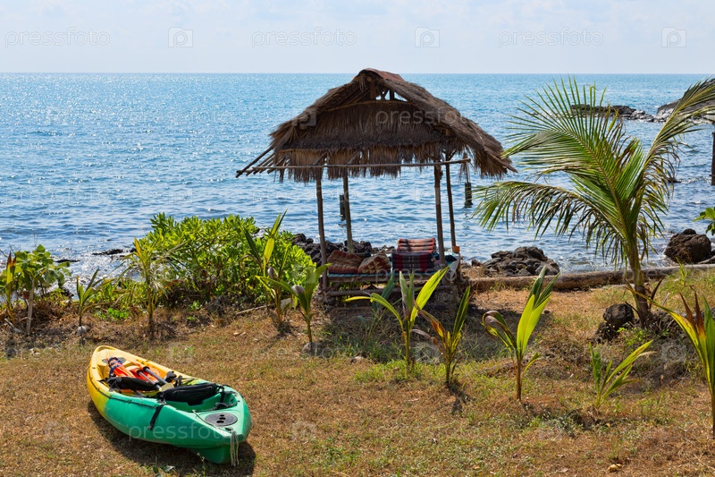Пластиковый каяк на берегу возле хижины