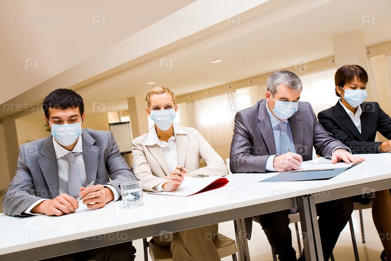 Портрет группы деловых партнеров в защитных масках во время работы