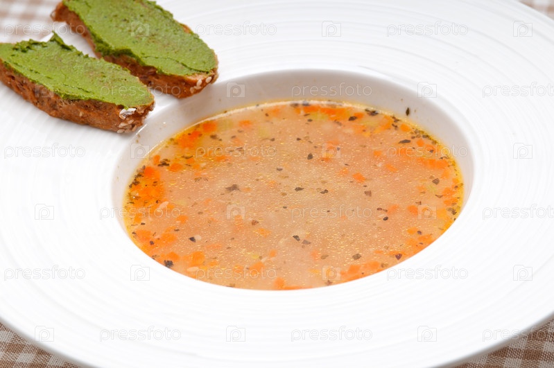 Итальянский суп минестроне с кростини с песто на бортике тарелки