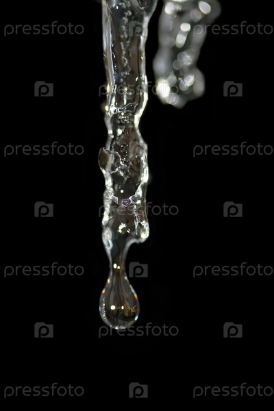 Прозрачная сосулька с капелькой на черном фоне