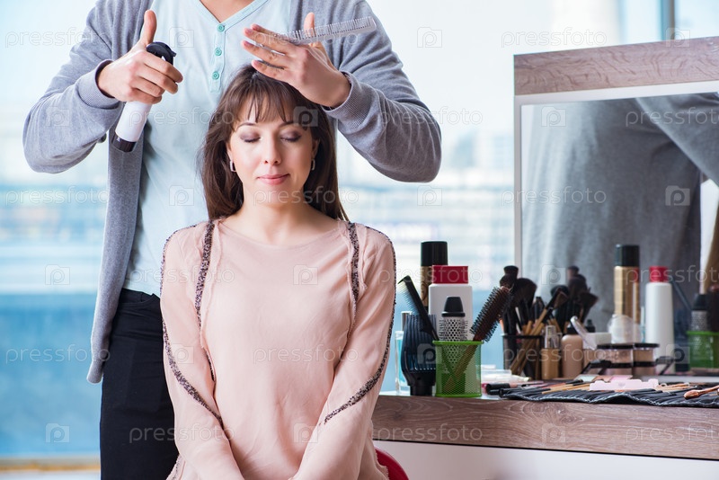 Мужской стилист, работающий с женщиной в салоне красоты