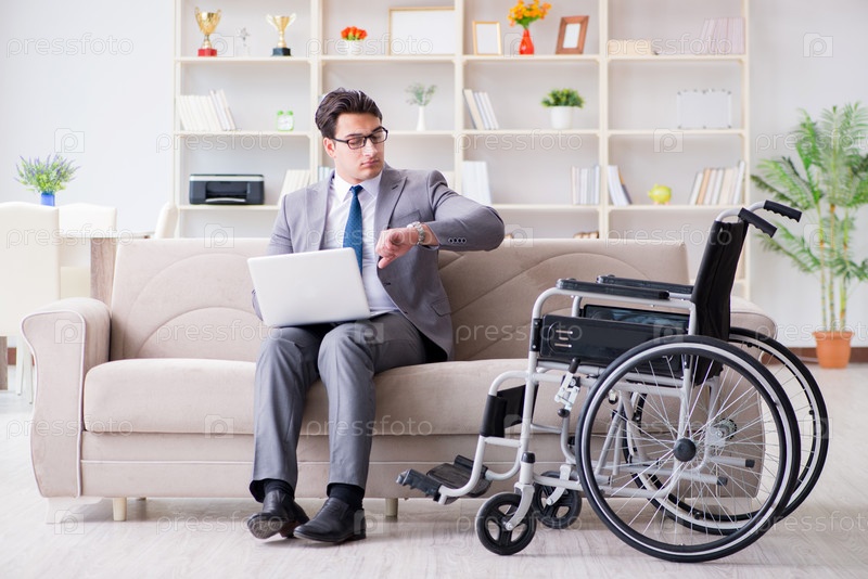 Инвалидный бизнесмен на инвалидном кресле, работающий из дома