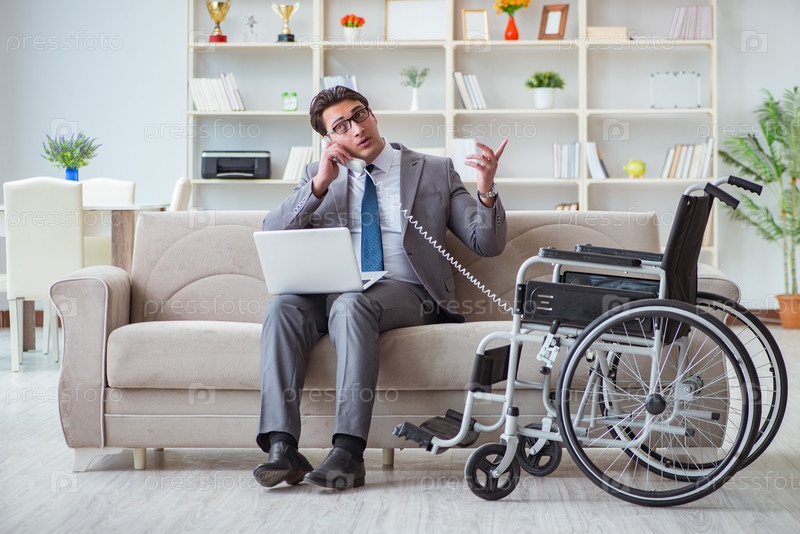 Инвалидный бизнесмен на инвалидном кресле, работающий из дома