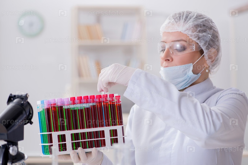 Женщина-врач проверяет образцы крови в лаборатории