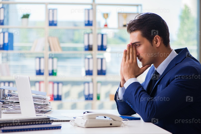 Молодой привлекательный бизнесмен-сотрудник, работающий в офисе за столом