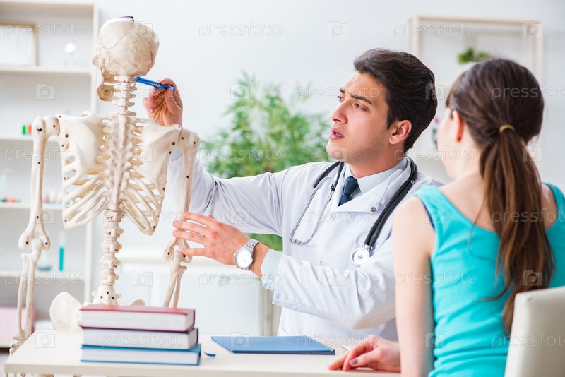 Врач показывает пациенту тип травмы на скелете