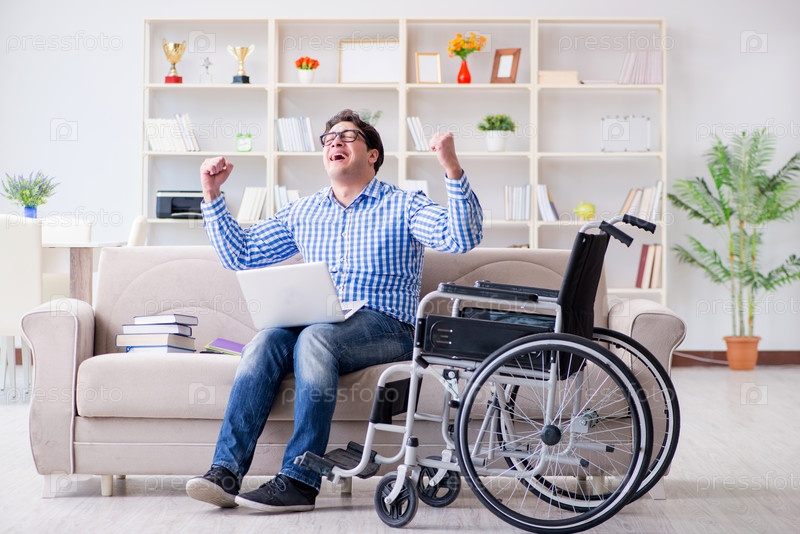 Молодой студент на инвалидной коляске в концепции инвалидности