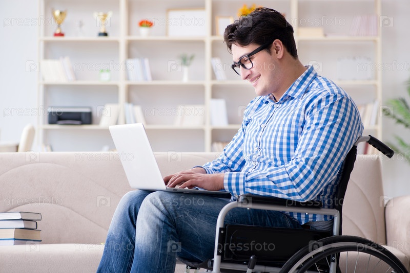 Молодой студент на инвалидной коляске в концепции инвалидности