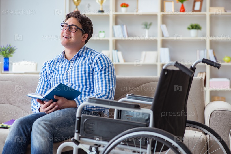 Молодой студент на инвалидной коляске в концепции инвалидности