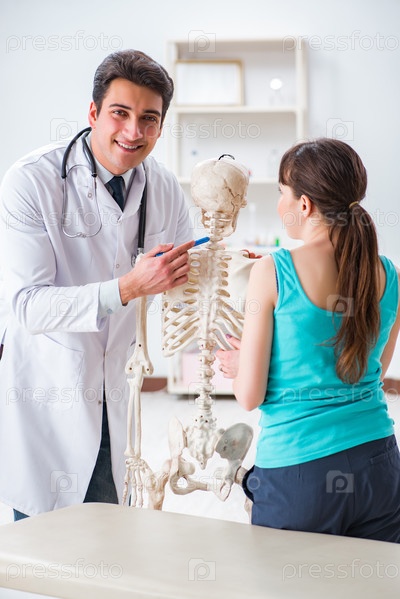 Врач показывает пациенту тип травмы на скелете