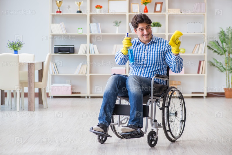 Инвалид на инвалидной коляске убирает дом