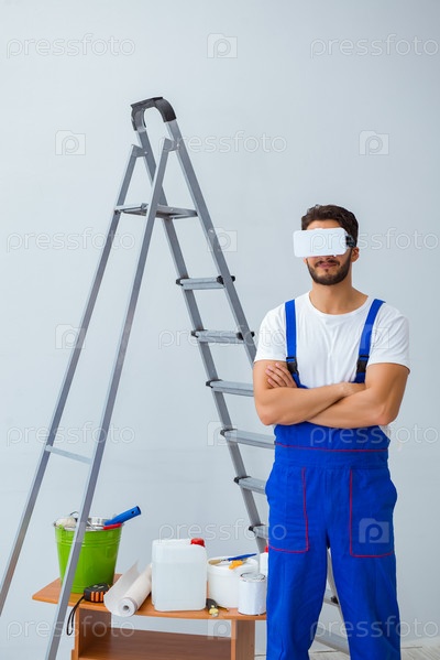 Мужчина с очками VR наклеивает обои