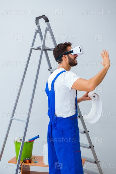 Мужчина с очками VR наклеивает обои