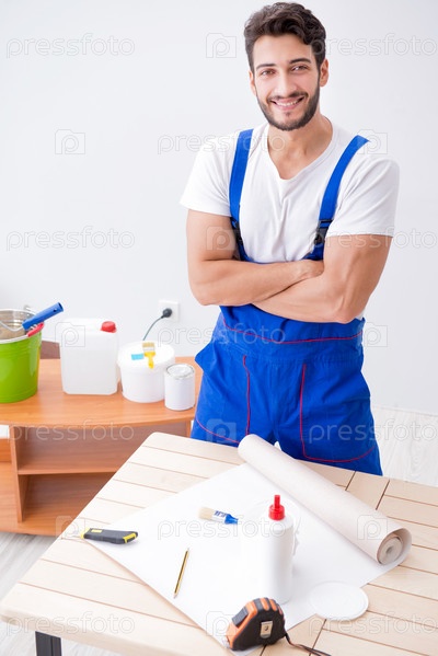 Мужчина в комбинезонах делает улучшения дома
