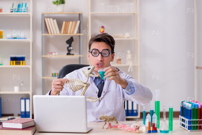 Забавный ученый со скелетом кошки в лабораторной клинике