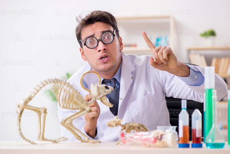 Забавный ученый со скелетом кошки в лабораторной клинике