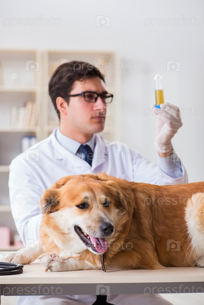 Врач осматривает собаку золотого ретривера в ветеринарной клинике