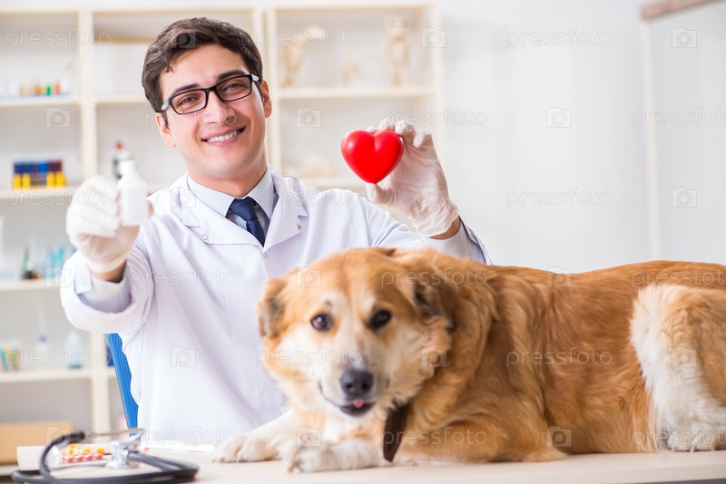 Врач осматривает собаку золотого ретривера в ветеринарной клинике
